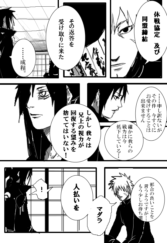 マダラと二人きりになりたい扉間と、そんな危ない事させたくないイズナの水面下とも表面的ともどちらとも言い難い攻防と、いまいち危機感の薄いマダラが、愛し過ぎて目眩がします。